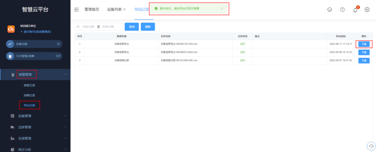 點擊確認后,會提示導出成功,在導出記錄中查看。然后下載導出的文檔