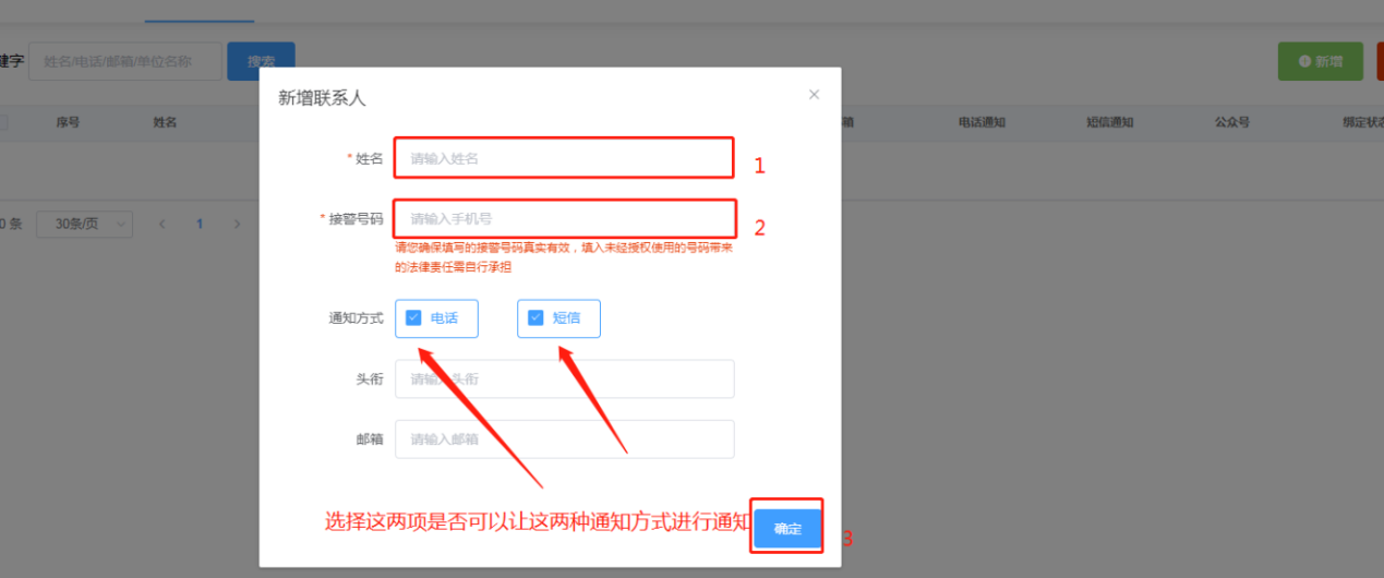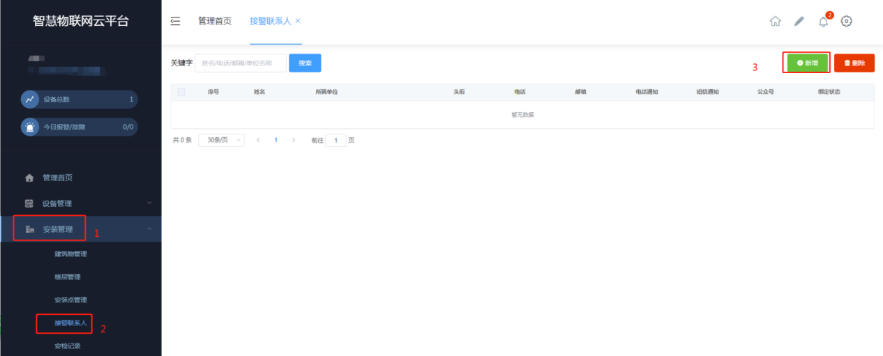 1. 進入系統菜單-1.安裝管理 -接警聯系人