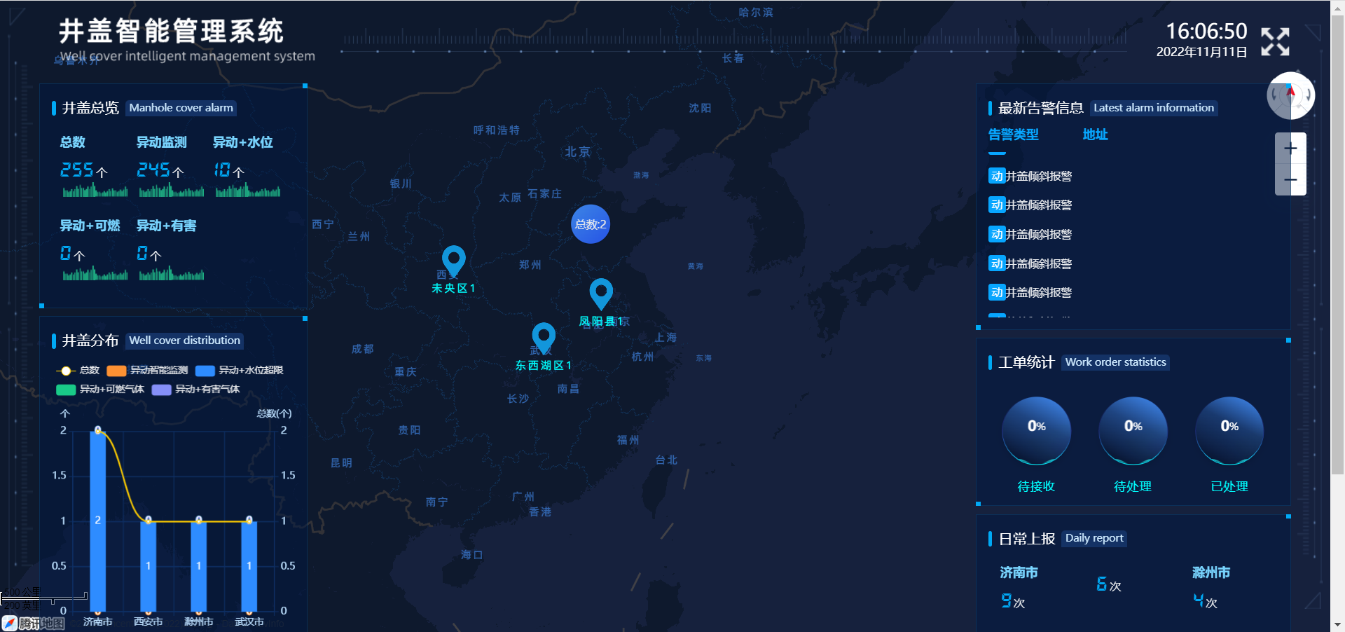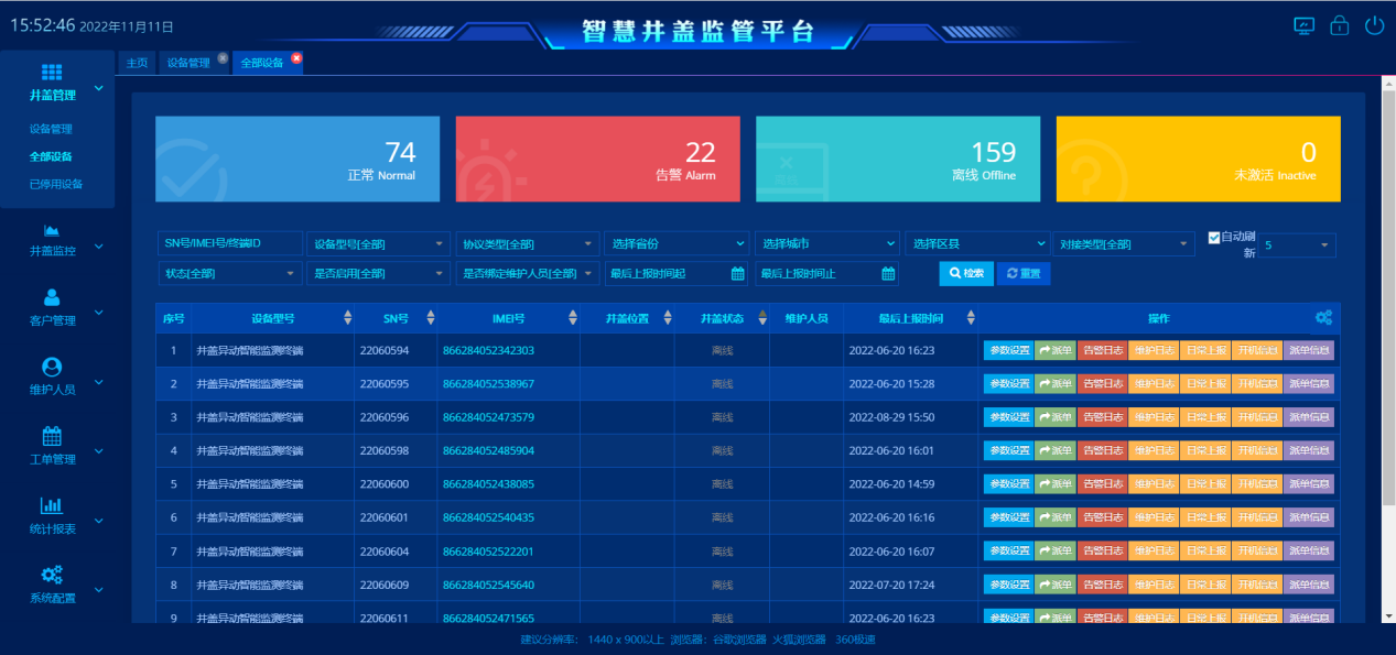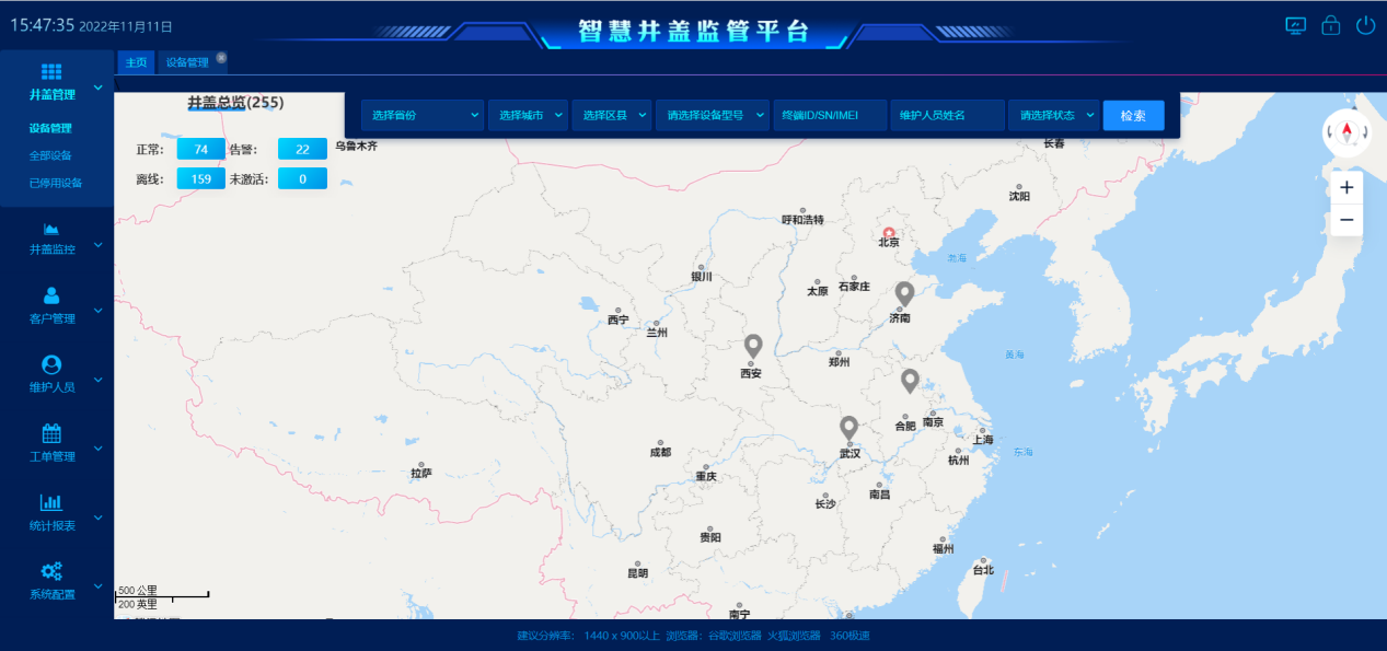實時監測井蓋狀態,井蓋異常即時上報,配套平臺支持報警高亮定位、報警信息同步發送,手機派單及維修反饋