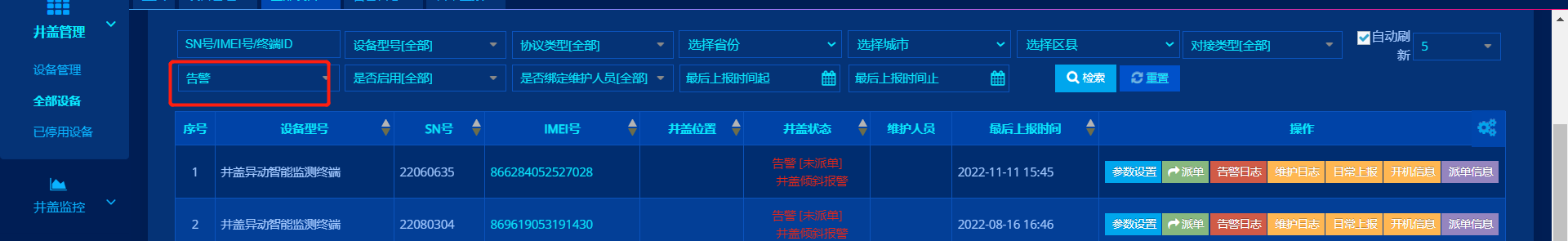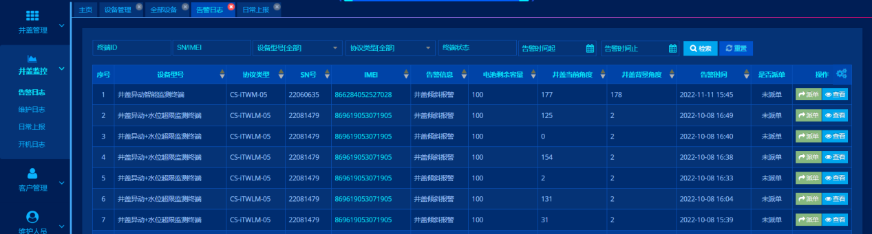 井蓋監控>告警日志