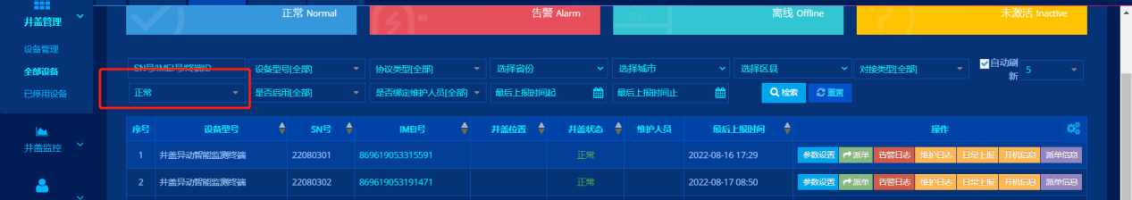 點擊“全部設備”,頁面上部顯示的是全部設備狀態以及查詢條件,中部為列表信息,下部為翻頁信息。頁面如下圖所示: