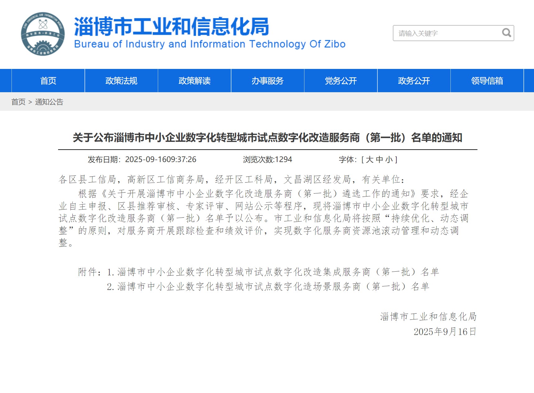 近日,淄博市工業和信息化局正式發布了《關于淄博市第一批中小企業數字化轉型城市試點數字化改造服務商名單的公示》,在眾多入選服務商中,山東一二三物聯網科技有限公司憑借其卓越的技術實力和服務能力,成功躋身集成服務商行列,為淄博乃至全省的中小企業數字化轉型貢獻力量。