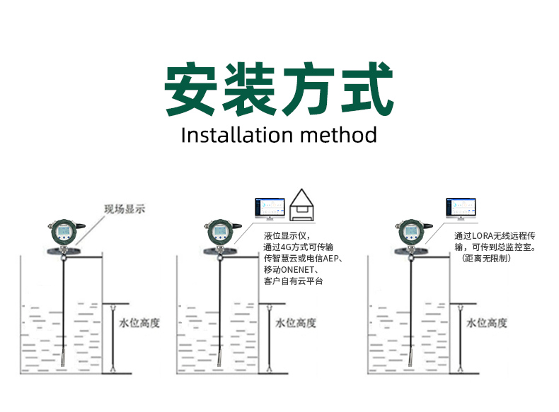 | 安裝方式 | 垂直、水平安裝,液位傳感器為投入式 |