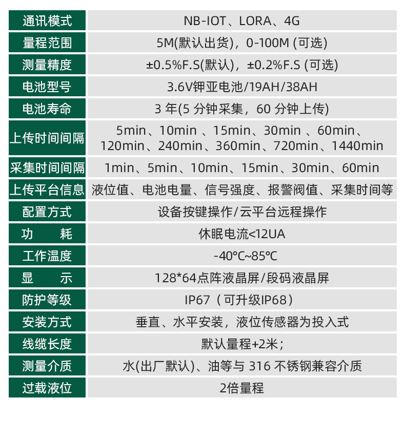 | 上傳平臺信息 | 液位值、睡眠時間、電池電量、信號強度、 報警閥值、檢測時間等 |