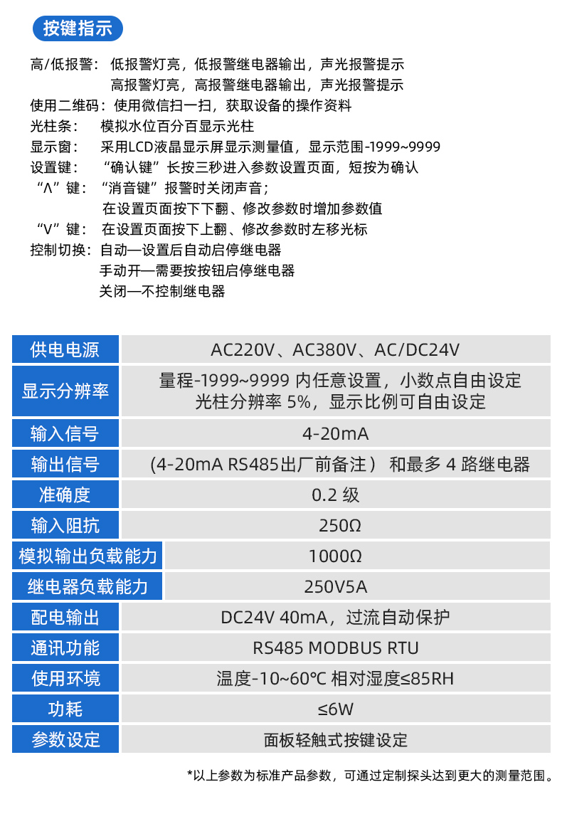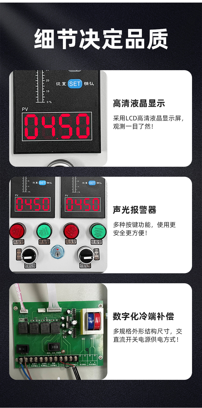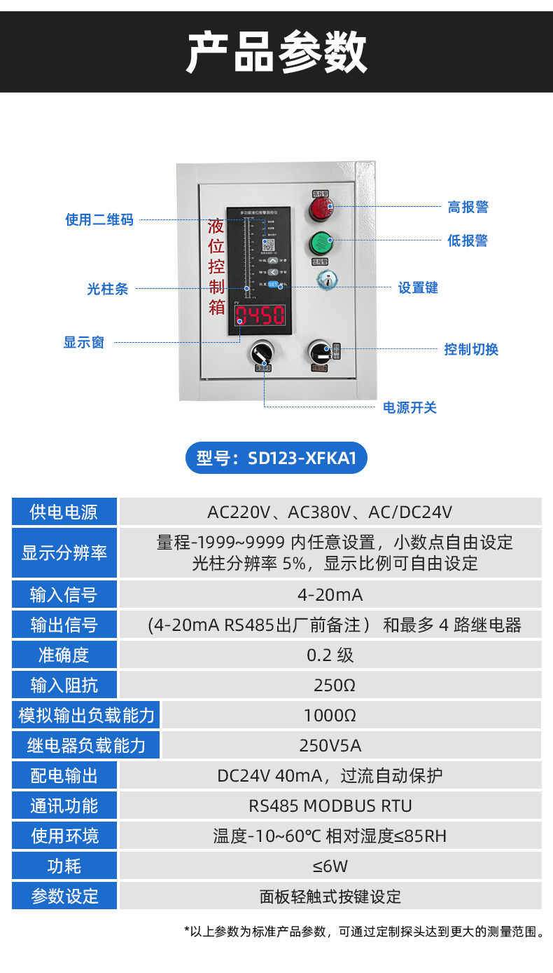 SD123-XFKA1是集顯示控制蜂鳴器報警于一體的顯示儀表,輸入標準4-20mA 信號,輸出標準 4-20mA 和 RS485 信號,按鍵操作,全開放內部參數,方便用戶自由設定,可廣泛用于液位,壓力,溫度,濕度,流量,電流,電壓等過程量顯示與控制。